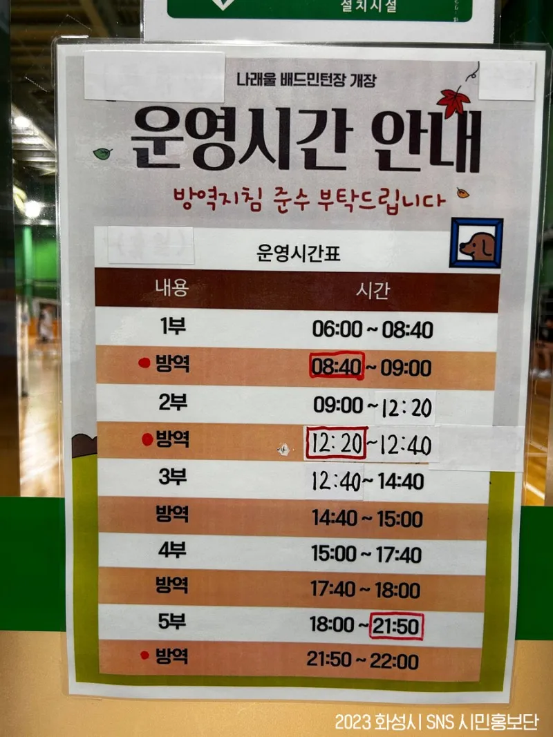 동탄 배드민턴장 운영시간 안내입니다. 1부~5부까지 운영하며 중간중간 방역 시간이 있으니 이용 시 참고해 주세요.