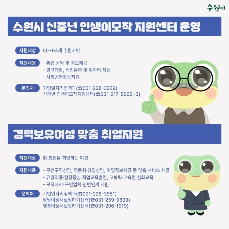 '수원시 신중년 인생이모작 지원센터 운영', '경력보유여성 맞춤 취업지원'