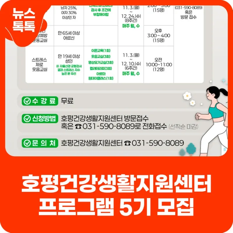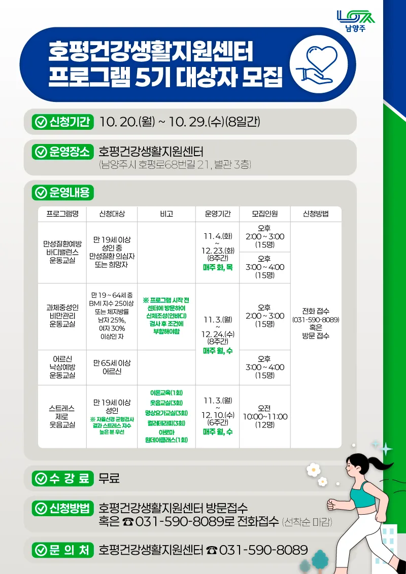 호평건강생활지원센터 방문접수 혹은 ☎031-590-8089로 전화접수(선착순 마감)