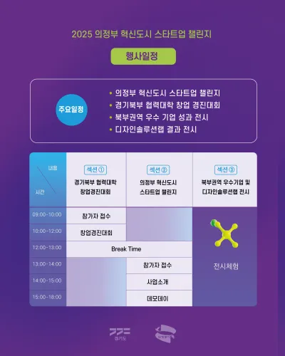 안녕하세요. 2025 의정부 혁신도시 스타트업 챌린지 운영사무국입니다. 본 행사는 월할한 운영과 참여자 안내를 위해 사전 등록을 시행합니다. 사전 등록 신청 시 수집되는 개인정보(성명, 소속, 연락처, 이메일 등)은 행사 운영 및 안내 목적에 한해 사용됩니다. ■ 행사 개요 · 행사명 : 2025 의정부 혁신도시 스타트업 챌린지 · 일 시 : 2025년 11월 14일 (금) 10:00 ~ 18:00 · 장 소 : 이음 갤러리 (의정부 대합실 4층) ■ 주요 프로그램 · 섹션1 : 경기북부 협력대학 창업경진대회 · 섹션2 : 의정부 ...