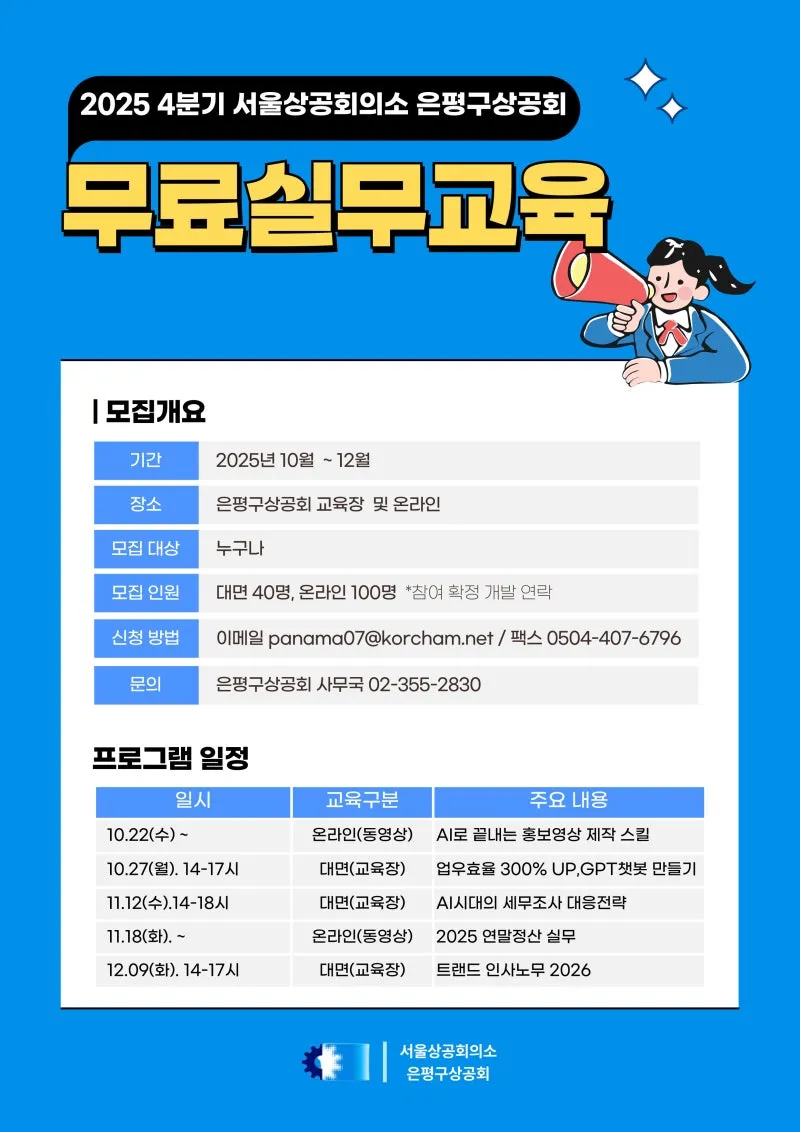 은평구상공회 10~12월 무료교육 신청 안내 "AI 활용 홍보영상 제작, 연말정산 실무 등"