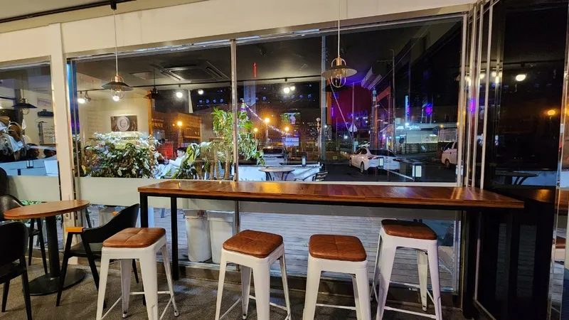 테이블은 3~4인석이 몇 개 놓여 있고 이렇게 바 테이블이 4인석으로 놓여 있습니다.