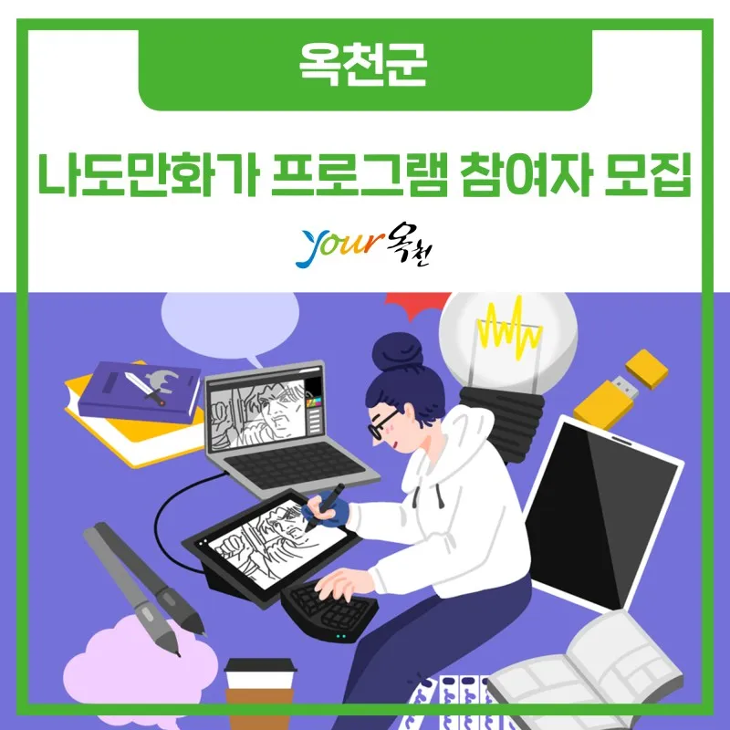 옥천군 농업기술센터에서 디지털 드로잉을 배우고 나만의 굿즈를 만들어보는 '나도 만화가 프로그램' 참가자를 모집합니다.