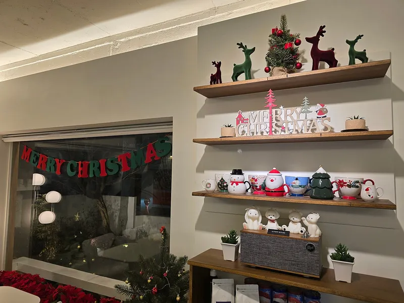 크리스마스 시즌을 맞이해 카페 곳곳에 크리스마스 장식이 꾸며져 있었습니다. 크리스마스를 테마로 한 다양한 소품들도 가득했습니다.