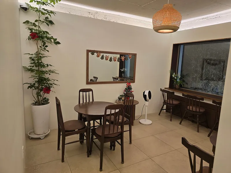 네모난 유리창에 흰색 커튼까지 더해져서 더욱 고급스러운 모습입니다. 테이블과 좌석이 많아서 소규모 모임을 가지기에도 좋은 공간입니다.