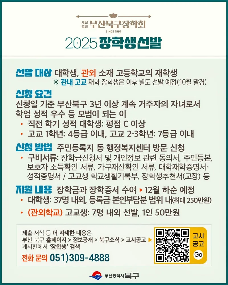 ✅ 신청 요건 신청일 기준 부산북구 3년 이상 계속 거주자의 자녀로서학업 성적 우수 등 모범이 되는 이