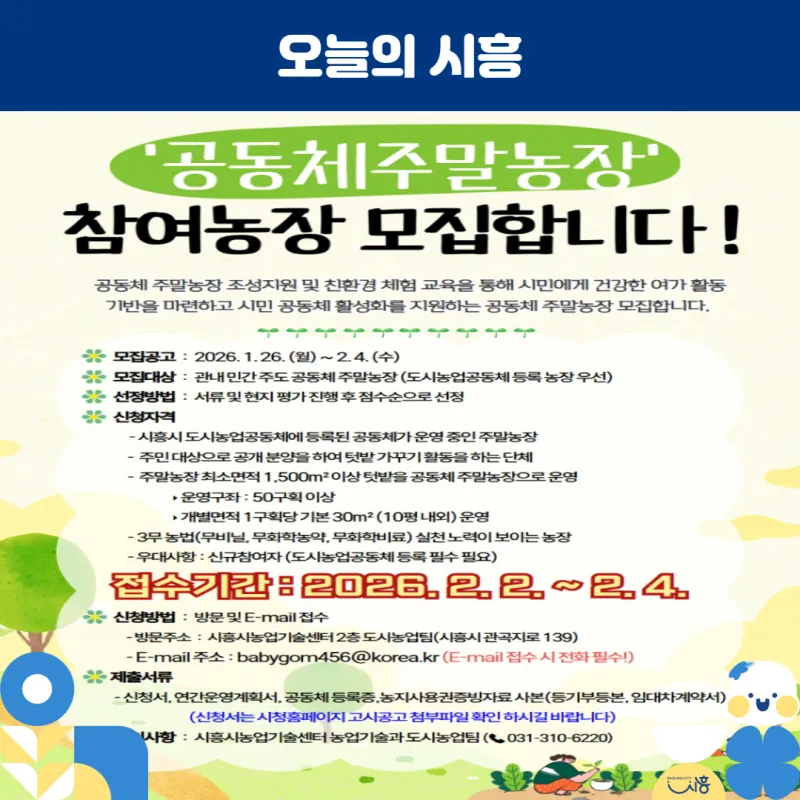 시흥시는 도시민의 농업 체험 기회를 확대하고 지역공동체 활성화를 도모하기 위해 ‘2026년 공동체 주말농장 조성 및 운영 지원 사업’을 운영하는 가운데, 민간 주도 공동체 주말농장 5곳을 오는 2월 2일부터 4일까지 모집합니다.