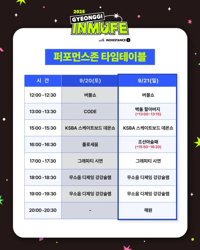 ☑️ 2025 경기인디뮤직페스티벌 퍼포먼스존 타임테이블(9/21(일))