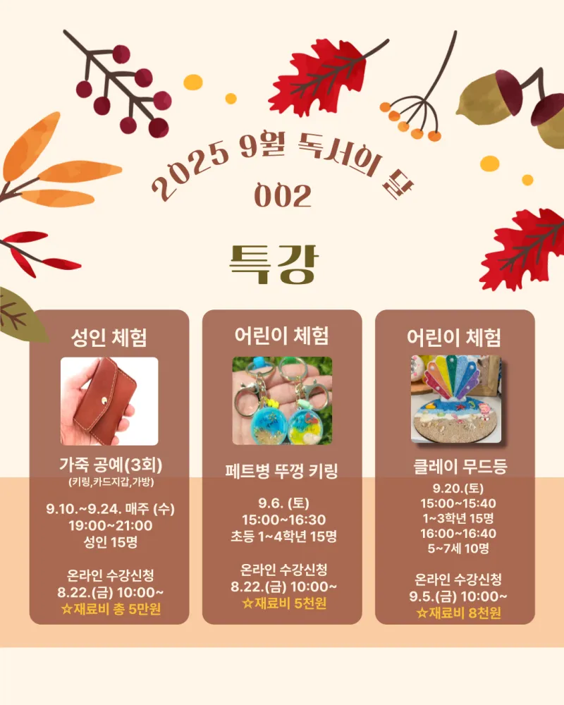 - 특강 및 프로그램: 가죽공예 체험, 페트병 뚜껑 키링 만들기, 빅마마 선생님과 동화속으로 풍덩 등