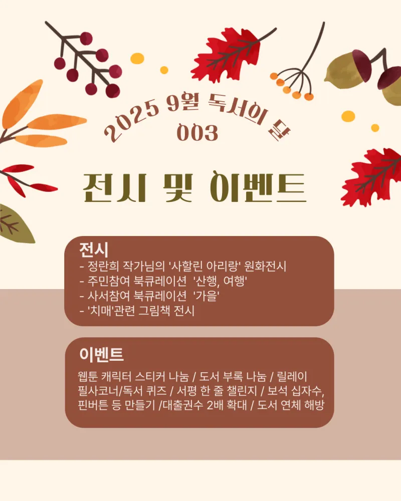 - 행사: 릴레이 필사코너, 부록나눔, 서평쓰기, 대출권수 확대, 도서연체 해제, 웹툰 캐릭터 스티커 나눔, 독서퀴즈