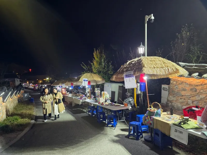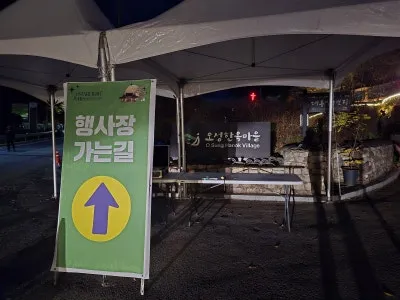 오성한옥마을을 따라 올라가는 길입니다. 어두운 길 돌담과 한옥에 조명을 설치해 따뜻한 분위기가 운치 있었습니다.