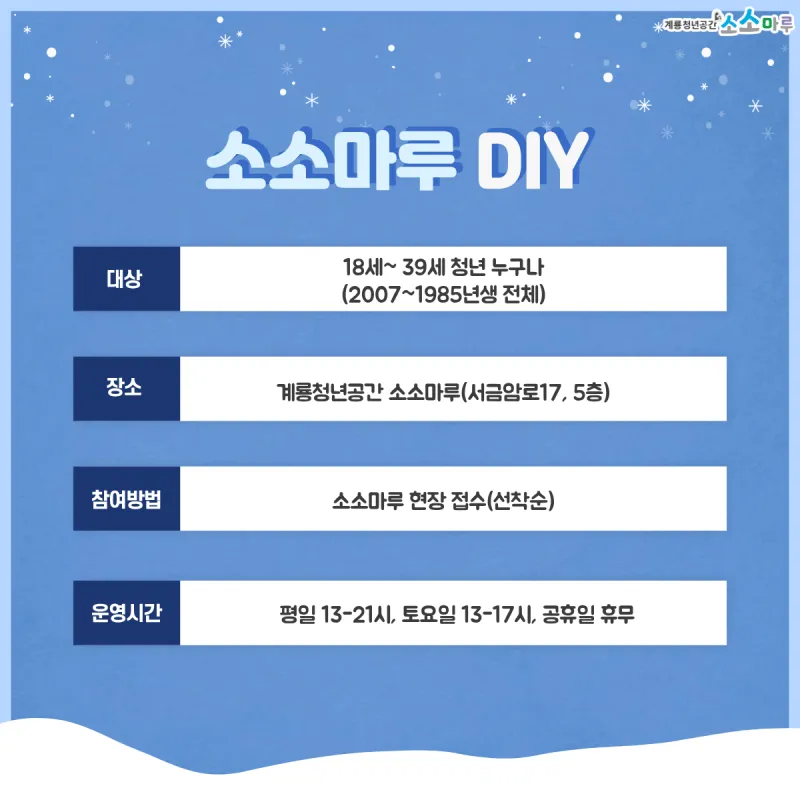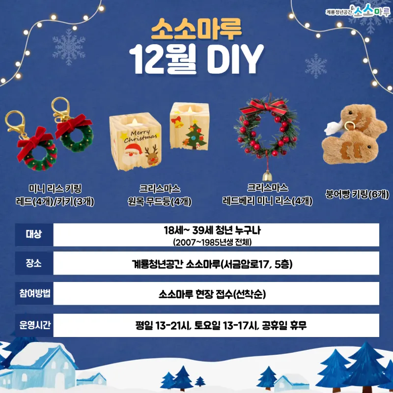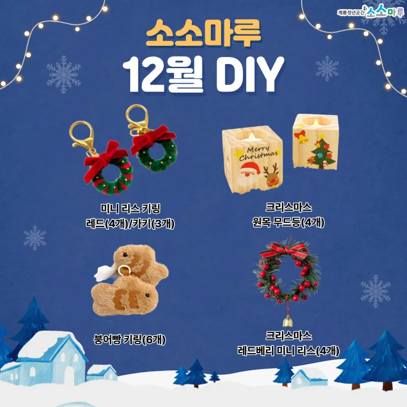 {"title":"소소마루 12월 DIY!","source":"https://blog.naver.com/gyeryongcity1/224095298924","blogName":"계룡시청","domainIdOrBlogId":"gyeryongcity1","nicknameOrBlogId":"계룡시청","logNo":224095298924,"smartEditorVersion":4,"blogDisplay":true,"cafeDisplay":true,"meDisplay":true,"lineDisplay":true,"outsideDisplay":true}