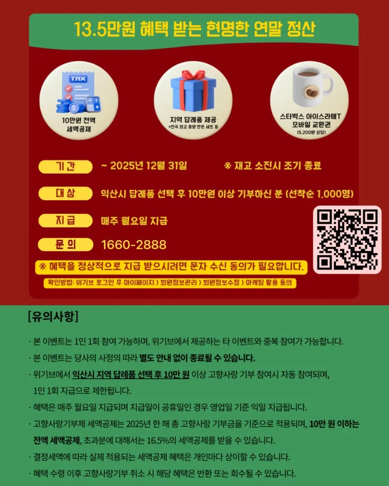 ✅ 참여방법 : QR또는 링크를 통해 이벤트 페이지 접속 후 익산시 답례품 선택하여 10만원 이상 기부