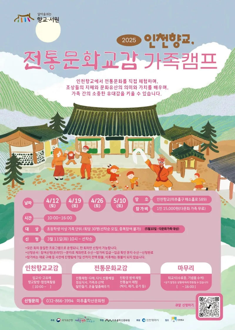 [2025 향교서원 국가유산 활용사업,'인천향교, The 다가감.'] - 전통문화교감 가족캠프 '전통문화교감 가족캠프'는 '인천향교'에서 가족과 함께하는 전통문화 체험 프로그램입니다. ✅ 일시 : 4월 12일(토) 오전 10시-16시 4월 19일(토) 오전 10시-16시 4월 26일(토) 오전 10시-16시 5월 10일 (토) 오전 10시-16시(다문화가족만 가능) ✅ 장소 : 인천향교 ✅ 모집기간 :3월 11일 화요일 10시부터. ✅ 대상 : 가족단위, 초등학교 1학년 이상 (회당 30명 선착순 모집) ✅ 참가비 : 1인당 15,...