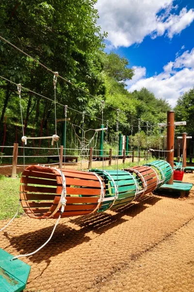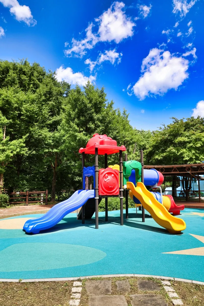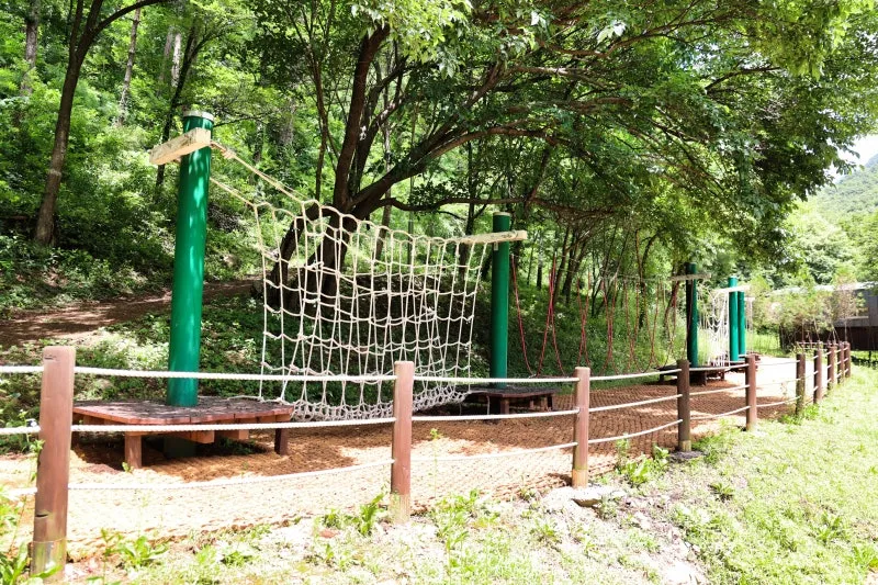 아이들이 신나게 뛰어놀 수 있는 숲속모험시설과 일반 놀이터도 있어
