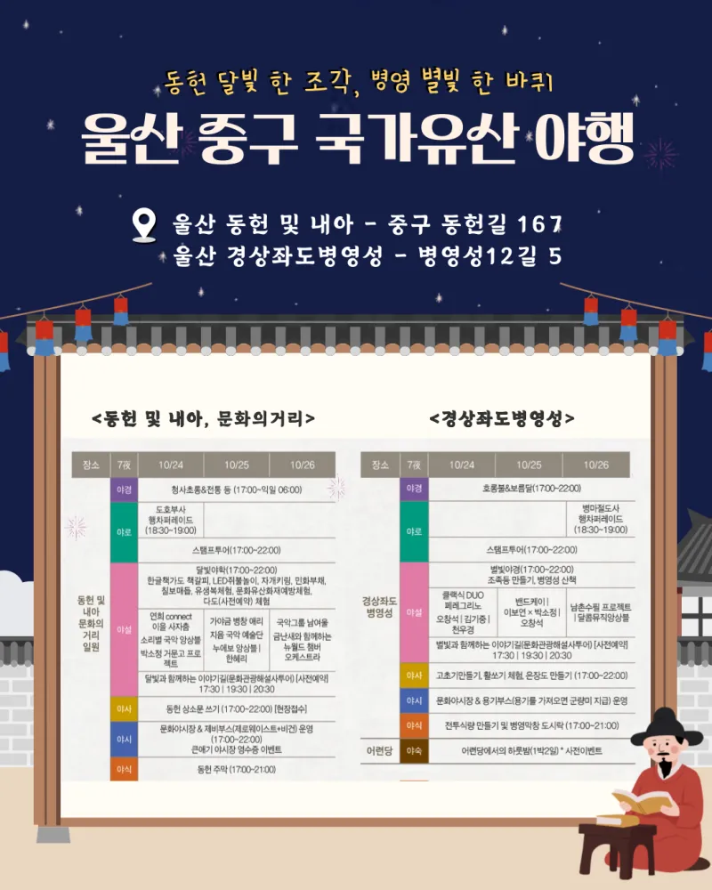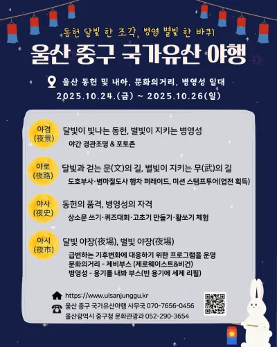 1일 동안 보지 않음 닫기 2025 울산 중구 국가유산야행 울산 동헌 및 내아 울산 경상좌도병영성 공지사항 2025 울산 중구 국가유산야행 울산 동헌 및 내아 울산 경상좌도병영성 공지사항 10.24(금)~26(일) 17시~22시 울산 동헌 및 내아 : 중구 동헌길 167 울산 경상좌도병영성 : 중구 서동 149-8 울산 중구 국가유산야행 사무국 문의 : 070-7656-0456 https://www.ulsanjunggu.kr @heritagenight_ulsan