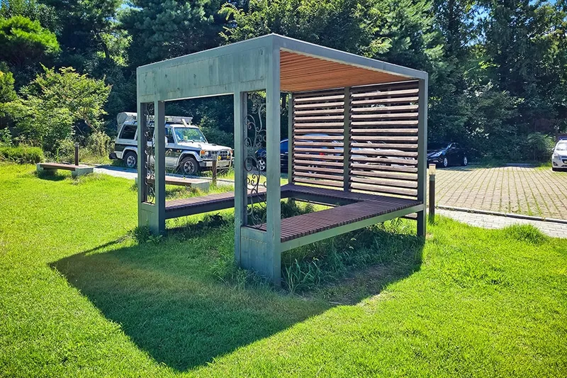 주차장도 있으며 그 옆에는 그늘이 있는 의자도 놓여 있어 간단히 휴식을 취할 수 있습니다.