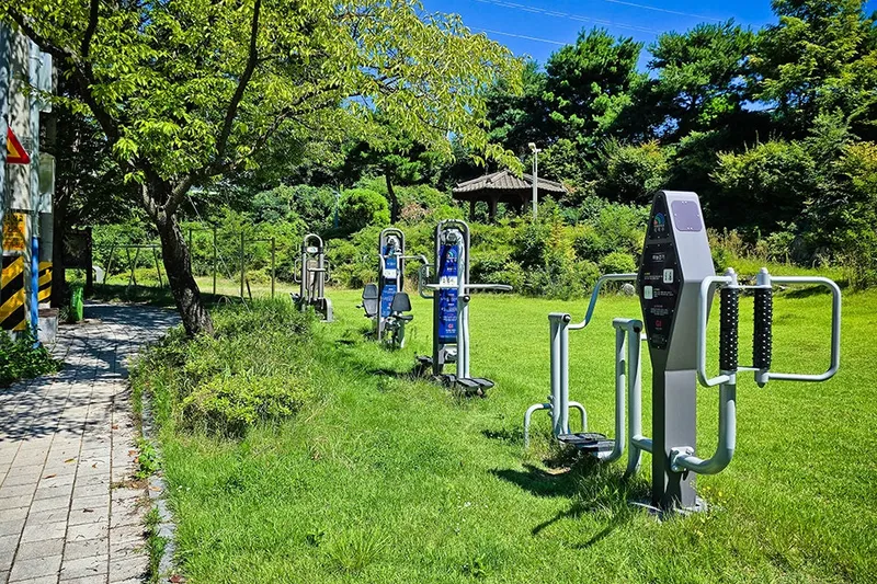 나무 그늘 옆에는 운동 기구도 설치되어 있어 간단히 몸을 풀거나 운동을 즐길 수 있습니다. 초록의 자연 풍경을 바라보고 운동을 즐기면 몸이 더 건강해지지 않을까 싶은 생각이 들었습니다.