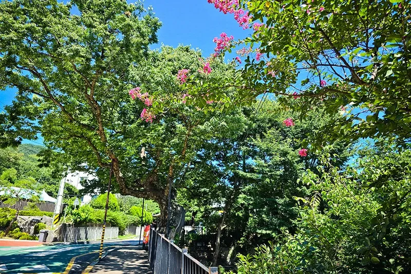 주변을 둘러보니 가지 끝에 매달려 핀 배롱나무꽃도 볼 수 있었습니다. 초록색의 잎들 사이로 분홍색의 배롱나무꽃이 피어나니 더욱 돋보였습니다.