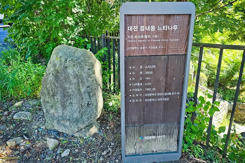그 위로 조금 올라가니 대전 대덕구 읍내동 느티나무 보호수 표지판도 세워져 있습니다. 나무 높이가 16m나 되며 둘레가 4.5m가 되는 이 느티나무는 1982년에 수령이 380년이라고 하니 지금은 400년이 넘은 셈입니다. 오랜 세월 묵묵히 한 자리에서 살아있는 전설을 보는 듯했습니다.
