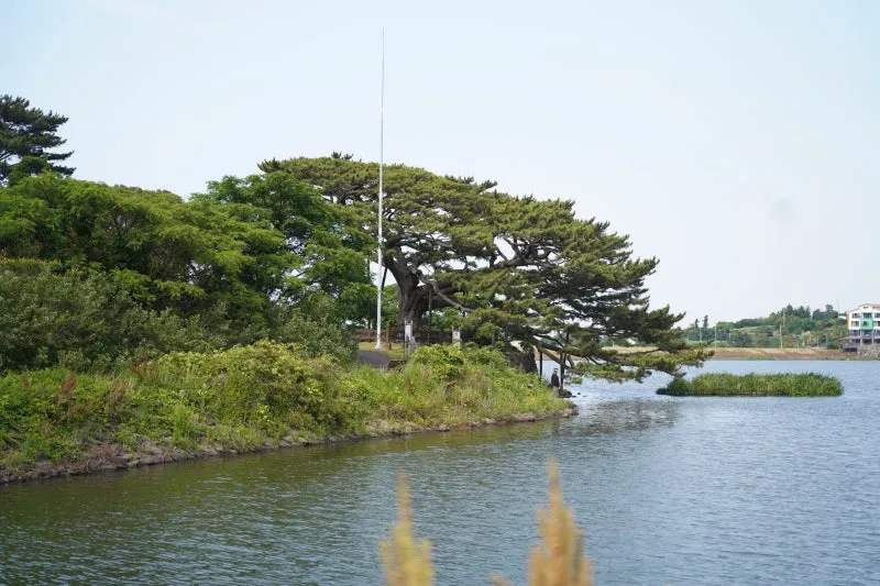 잔잔한 수면 위로 뻗은 소나무를