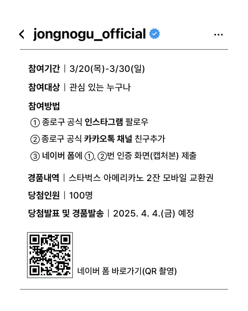 ✅참여기간: 2025. 3. 20.(목)~3. 30.(일) ✅참여대상: 관심 있는 누구나! ✅참여방법 1) 종로구 공식 인스타그램 팔로우! 2) 종로구 공식 카카오톡 채널 친구추가 - 카카오톡 상단 검색창에 "종로구청" 검색 후 친구추가 3) 네이버 폼에 1,2번 인증 화면(캡처본) 제출 - 네이버 폼: https://naver.me/FG7i3PTm * 종로구 공식 인스타그램 프로필 하이라이트 이벤트 클릭하여 링크 접속해도 됩니다. 🎁당첨경품🎁