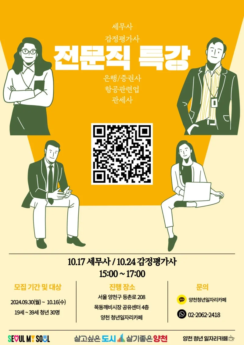 안녕하세요! 양천 청년 일자리카페입니다. 2024년 10월 취업특강-전문직특강 참여자를 모집합니다~! ✅10월 17일(목) 전문직 특강 : 현직 세무사와의 만남 ✅10월 24일(목) 전문직 특강 : 현직 감정평가사와의 만남 ✅공통 주제 : 1.직업 소개 - 하는 일 소개 및 실제 업무 진행 사례 2. 직업 전망 - 수익 및 분야별 하는 일 3. 직업 준비에 적합한 성향 4. 준비방법 / 준비기간 📌특강강사 : 장윤지 세무사/ 이성준 평가사 📌참여대상 : 19세 ~ 39세 청년 구직자 20명 📌모집기간 : 2024. 09. 30...