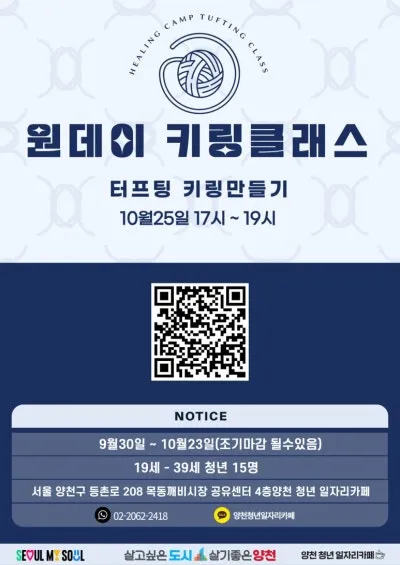 loop건을 이용한 터프팅 키링 원데이 클래스 📌 모집인원 총 15명 (무작위 선발) 📌 참여대상 19~39세 청년 구직자 (양천구 우대) 📌 모집기간 2024. 9. 30.(월) ~ 마감시 📌 프로그램 일시 2024. 10. 25. (금) 오후 5시~7시 📌 진행 장소 양천 청년 일자리카페(서울시 양천구 등촌로 208 목동깨비시장 공유센터 4층) ⚠️ 주의사항 ⚠️ 1. 참여신청서 제출 시 개인정보활용 동의한 것으로 갈음합니다. 2. 프로그램 특성상 사진 촬영이 있습니다. 📌 문의 ☞양천청년일자리카페 카카오톡채널 : h...