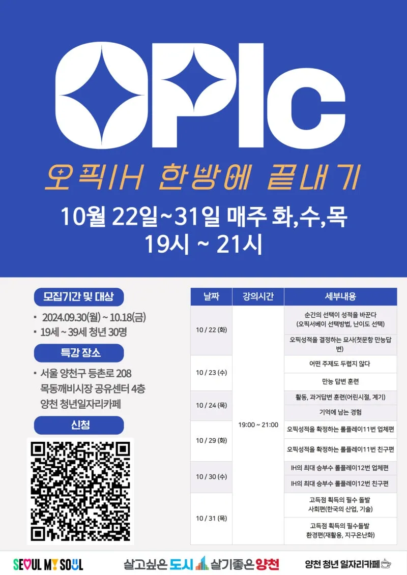 안녕하세요! 양천 청년 일자리카페입니다. 2024년 10월22일 ~ 10월31일 매주 화,수,목 19시~21시 (2시간) 에 진행하는 오픽 IH 한방에 끝내기 참여자를 모집합니다~! 📌6회 모두 참여 가능하신분만 신청해주세요!📌 ★10월 22일(화), 10월 23일(수), 10월 24일(목), 10월 29일(화), 10월 30일(수), 10월 31일(목) ★ ✅ 강지완 선생님 - 대한민국 오픽 도입의 장본인 - YBM 강남 OPIC 1위 강사 - 베스트셀러 저자 (YES24 한국을 빛내는 교육자 20인, 베스트셀러 다수 선정) ...