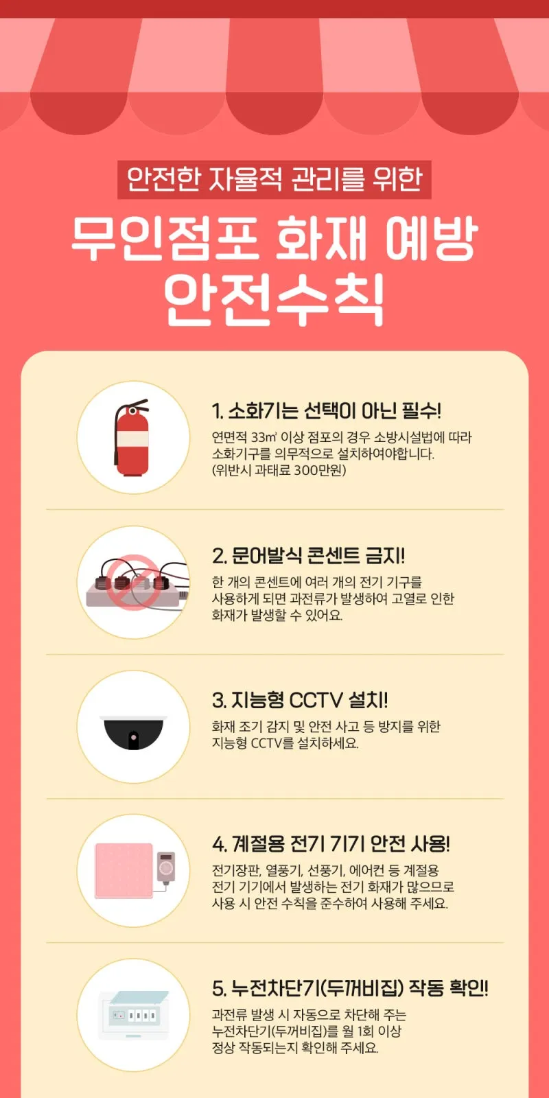 ✔️소화기는 선택이 아닌 필수! 연면적 33㎡이상 점포의 경우 소방시설법에 따라 소화기구를 의무적으로 설치해야 합니다. ※위반 시 과태료 300만 원 |