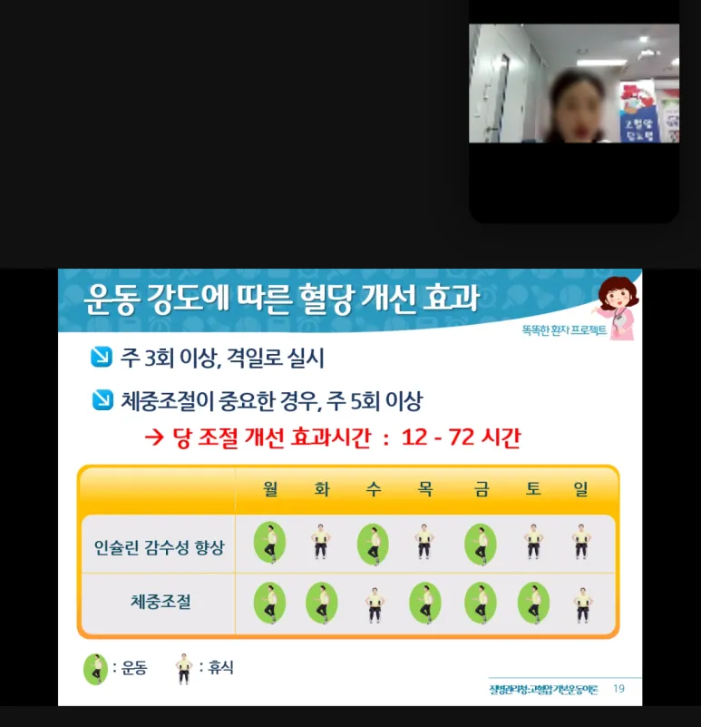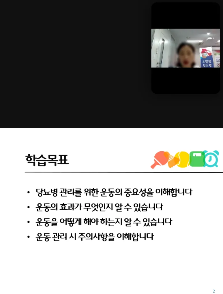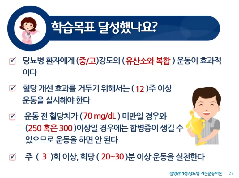 당뇨병에 관련된 운동의 중요성, 운동의 효과, 주의사항 등 학습목표를 토대로 다양한 정보를 쉽게 학습을 진행하였습니다.