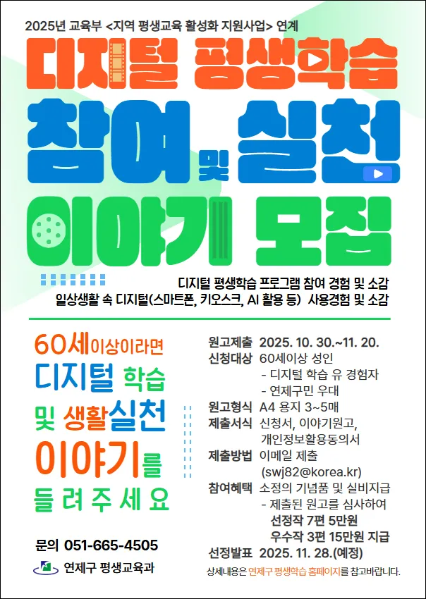 디지털 평생학습 참여 및 실천 이야기(꾼) 모집 안내 연제구 평생교육과에서는 2025년 교육부 공모 <평생학습도시 특성화 사업>의 일환으로 "디지털 평생학습 참여 및 실천 이야기(꾼)"을 모집합니다. 관심있는 대상자 분들의 적극적인 참여 바랍니다. ○ 사업목적 : 급속하게 변하는 디지털 시대 속에서 60세 이상 어르신들의 다양한 디지털 참여 경험에 대한 이야기를 발굴하여 어르신들에게 디지털 포용력을 향상시키고자 함 ○ 이야기(원고) 모집기간 : 2025. 10. 30.(목) ~ 11. 20.(목) ○ 신청대상 : 디지털 평생학습 참...
