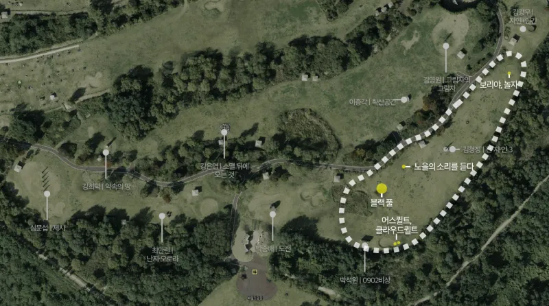 곽민준&박소연 작가 <블랙 풀> - 불규칙한 탄화목의 질감과 농담으로 물결 표현 김성수 작가 <어스퀼트>, <클라우드퀼트> - 노을공원의 서사를 솜이불과 지구를 연상케 하는 형태에 담아 치유 과정과 희망 표현 안지언 작가 <노을의 소리를 듣다> - 난지도 매립지가 인공산으로 거듭난 과정을 16면으로 구성된 파빌리온으로 표현 도수진 작가 <보리야, 놀자> - 마주 안고 있는 강아지와 소녀상을 통해 인간과 자연의 공생관계를 표현 |