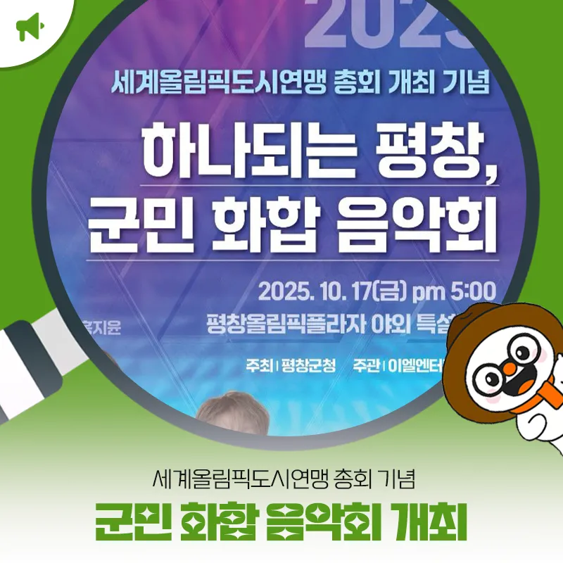 📍2025 세계올림픽도시연맹 총회 개최를 기념하여 오는 10월 17일 오후 5시, 평창올림픽플라자 잔디광장에서 ‘하나 되는 평창, 군민 화합 음악회’를 개최합니다!