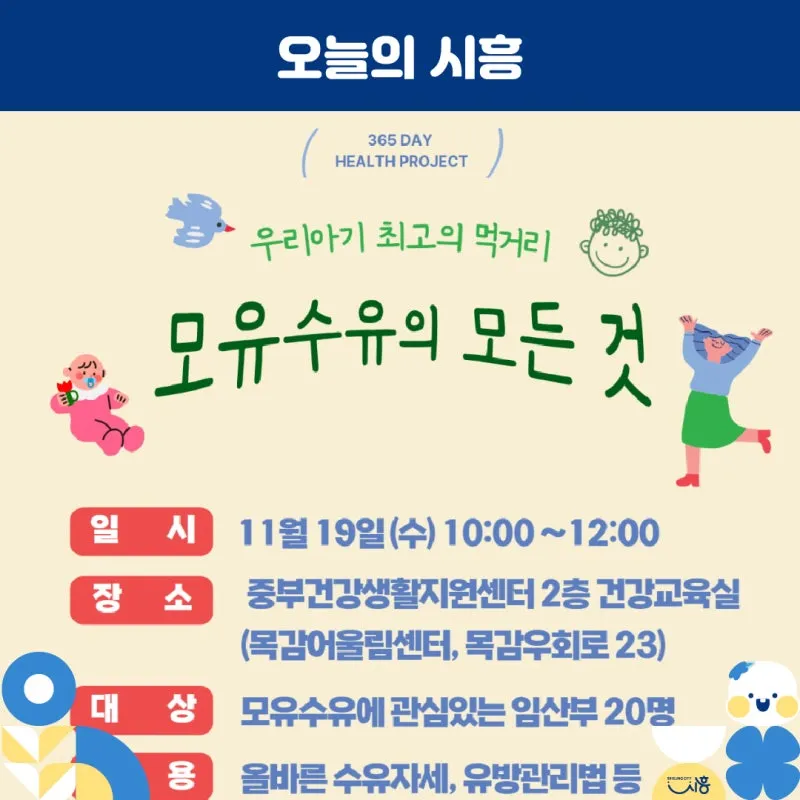 시흥시보건소 중부건강생활지원센터는 건강한 모유수유를 실천할 수 있도록 돕기 위해오는 11월 19일 목감어울림센터 2층 건강교육실에서 ‘모유수유교실' 프로그램을 운영합니다.