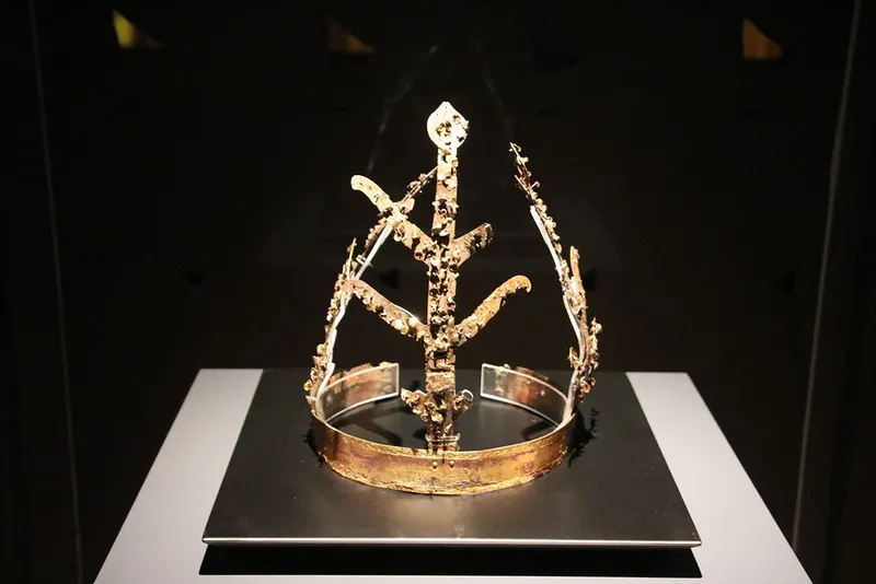 가야 금동관은 단순한 나뭇가지 모양인데요. 이는 신라의 화려한 금관과는 대조적입니다.
