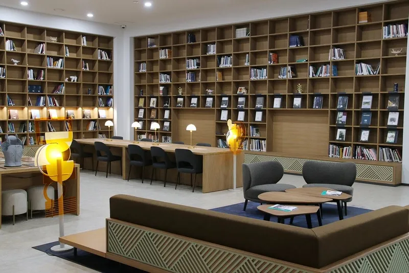 여러 도서가 진열되어 있으며 편한 의자에 앉아 책을 읽을 수 있는 공간입니다.