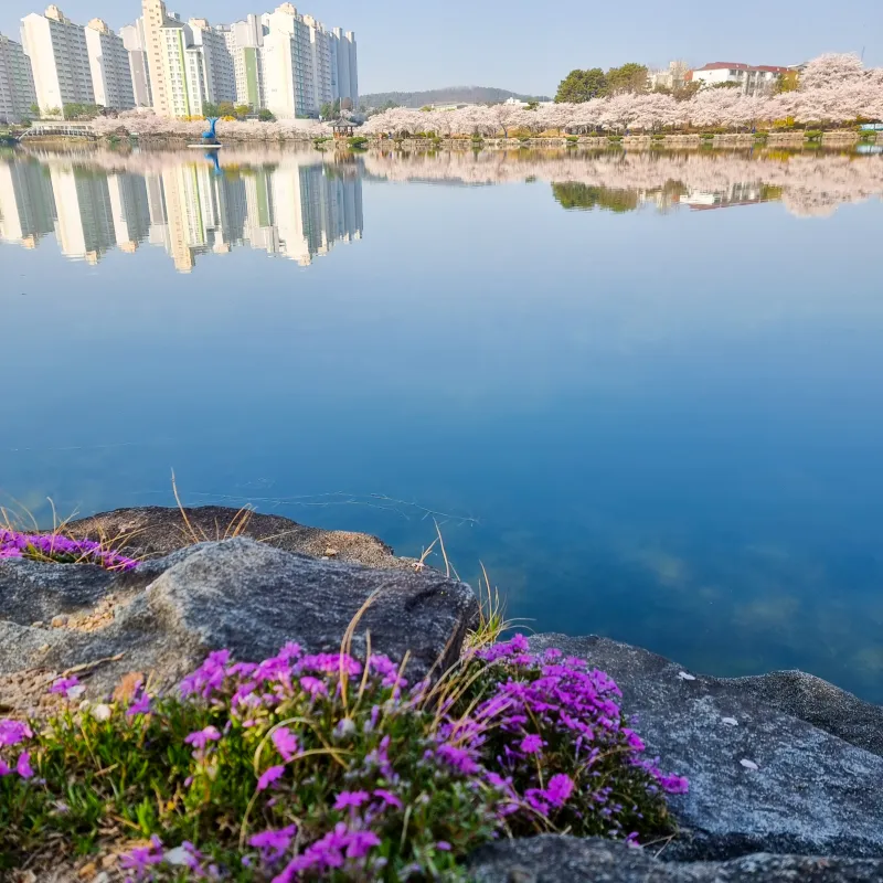 맑은 연못에 비친 벚꽃의 연분홍색이 수평을 이루며