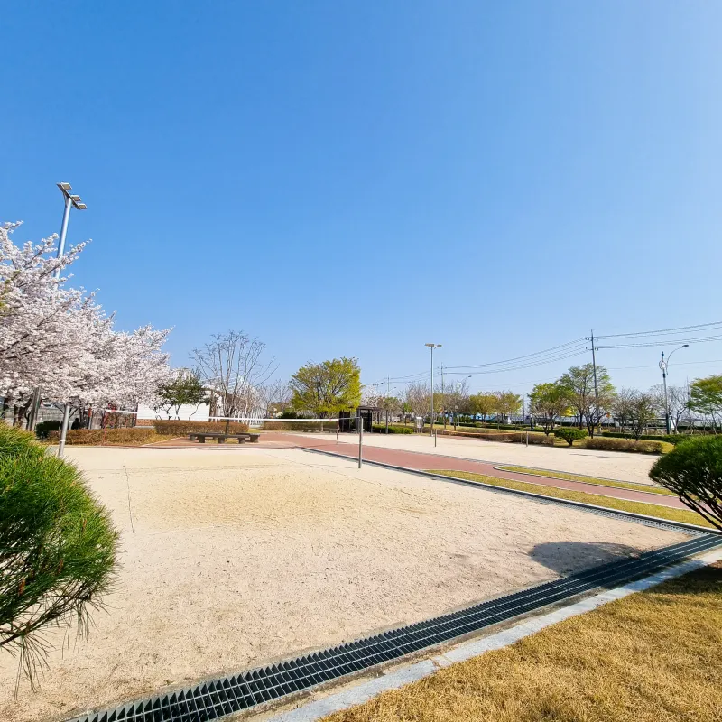 음악분수, 어린이 놀이터, 족구장, 운동기구, 발지압길,