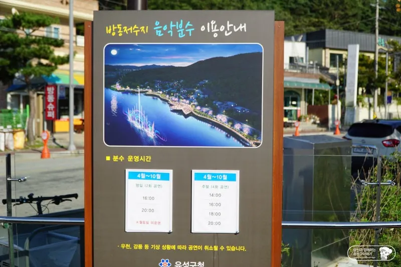 음악분수 가동시간은 4월~10월 현재 평일은 오후 4시, 오후 8시, 주말은 오후 2시, 4시, 6시, 8시에 운영하니 시간 맞춰서 방동 윤슬거리로 오시면 됩니다.