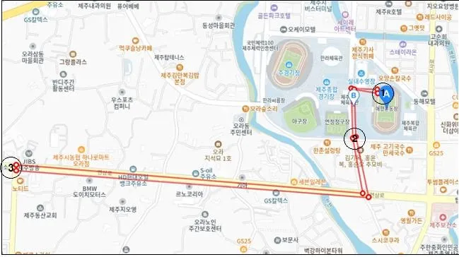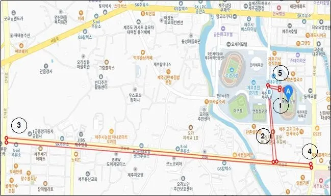 ①애향운동장→②명동칼국수 사거리→➂JIBS제주방송→④애향운동장