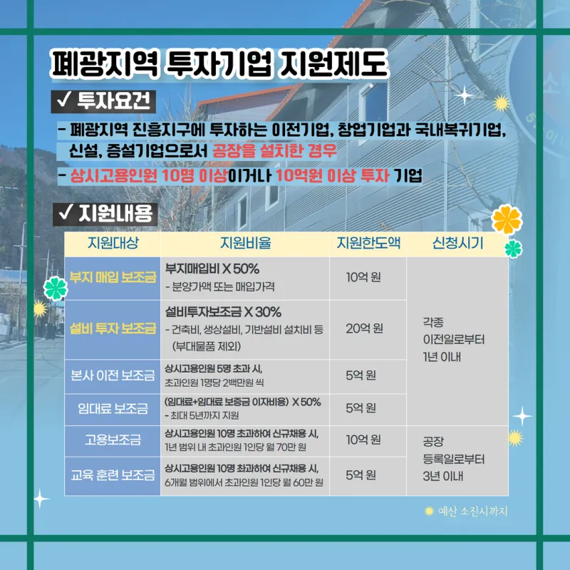- 폐광지역 진흥지구에 투자하는 이전기업, 창업기업과 국내복귀기업, 신설․증설기업으로서 공장을 설치한 경우