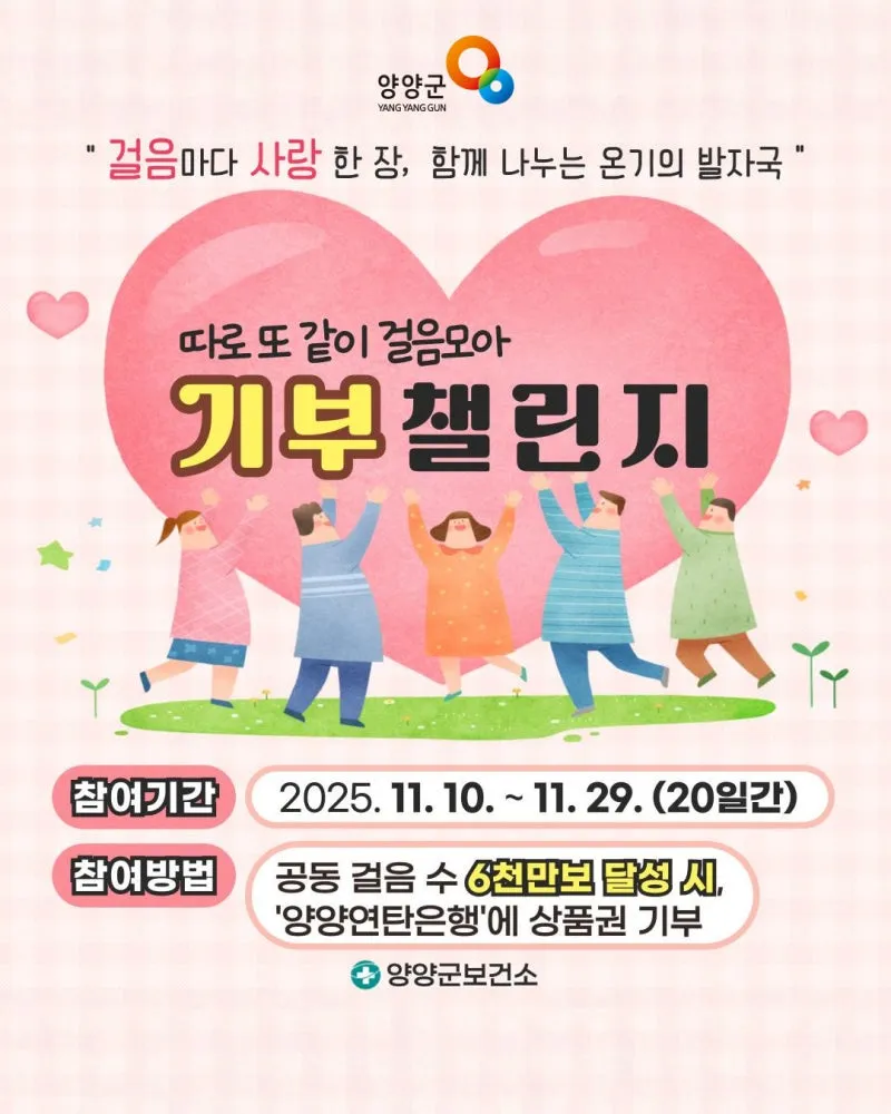 이번 챌린지는 참여자들의 누적 걸음 수가 6천만 보에 도달하면, 양양연탄은행에 200만 원 상당의 상품권을 기부하는 방식으로 운영됩니다.