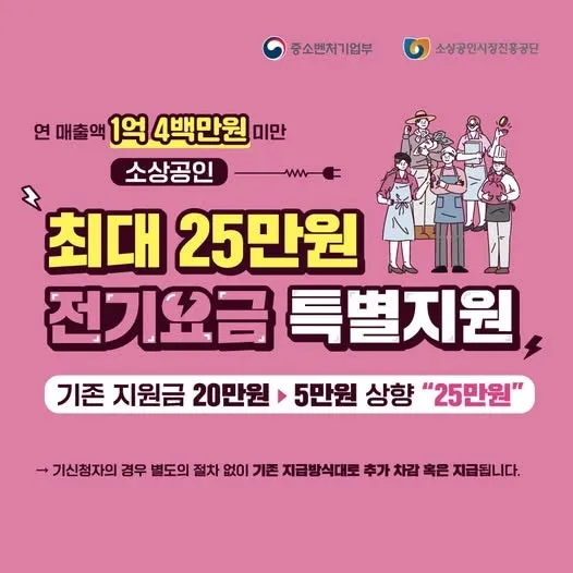 웰로1년 전연 매출액 1억 4백만원 미만 소상공인 최대 25만원 전기요금 특별지원 연 매출액 1억 4백만원미만 소상공인 최대 25만원 전기요금 특별지원 기존 지원금 20만원 ➡︎ 25만원 #포천 #더큰포천 #더큰행복 #중소벤처기업부 #소상공인시장진흥공단 #소상공인 #전기요금 {"title":"연 매출액 1억 4백만원 미만 소상공인 최대 25만원 전기요금 특별지원","source":"https://blog.naver.com/newspcs21/223689934536","blogName":"포천시 공..","blogId":"newspcs21","domainIdOrBlogId":"newspcs21","nicknameOrBlogId":"포천시","logNo":223689934536,"smartEditorVersion":4,"lineDisplay":true,"outsideDisplay":true,"meDisplay":true,"cafeDisplay":true,"blogDisplay":true} #포천#더큰포천#더큰행복#중소벤처기업부#소상공인시장진흥공단#소상공인#전기요금출처:https://blog.naver.com/newspcs21스크랩