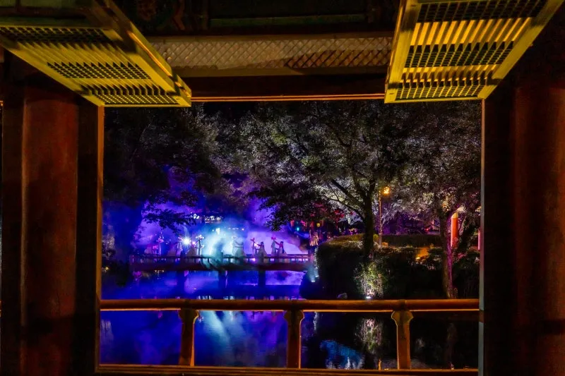 은은한 조명이 고풍스러운 누각을 감싸고,