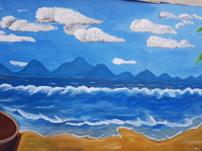 푸른 하늘, 바다, 모래사장이 그려져 있습니다.