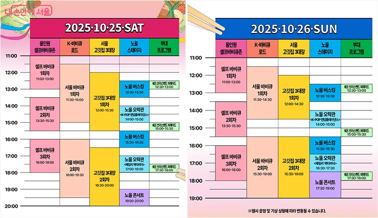2025 서울바비큐페스타 ○ 기간 : 10.25. 11:00 ~ 20:00 / 10.26. 11:00 ~ 19:00 ○ 장소 : 서울 노을공원 캠핑장 일대(서울 마포구 하늘공원로 108-2) ○ 주요 프로그램 - K-BBQ 빅3 : 올인원 셀프바비큐존, 서울 고깃집 3대장, K-바비큐 로드 - 노을스테이지 : 25일-민경훈, 신예영 / 26일–닐로, 전상근, 정효빈 |
