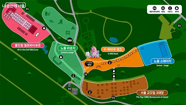 행사장 곳곳에는 대형 아트벌룬 ‘해치와 소울 프렌즈 포토존’, ‘카카오 프렌즈 포토존’이 마련돼 소중한 추억을 남길 수 있으며, 어린이 동반 가족을 위한 ‘여기저기 서울형 키즈 카페 in 바비큐(1일 3회 운영, 회당 이용료 5천 원)’도 운영된다.