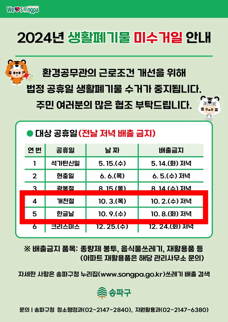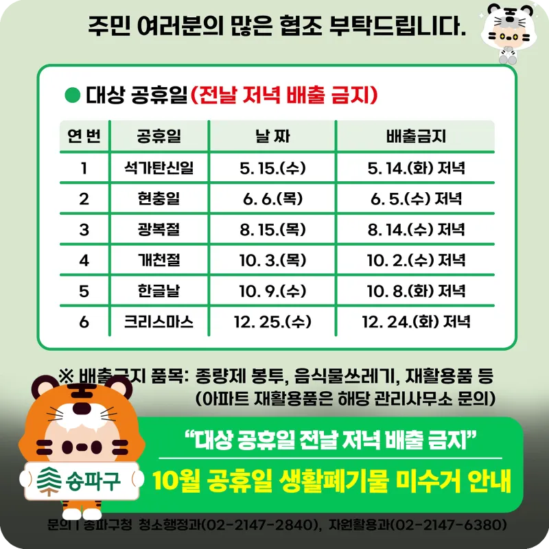 "10월 2일, 9일 쓰레기 배출 금지" 공휴일 전날 생활폐기물 배출 금지 안내