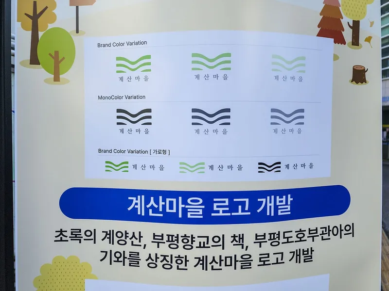 계산마을 로고는 초록의 계양산, 부평향교의 책, 부평도호부관아의 기와를 상징하는 디자인으로